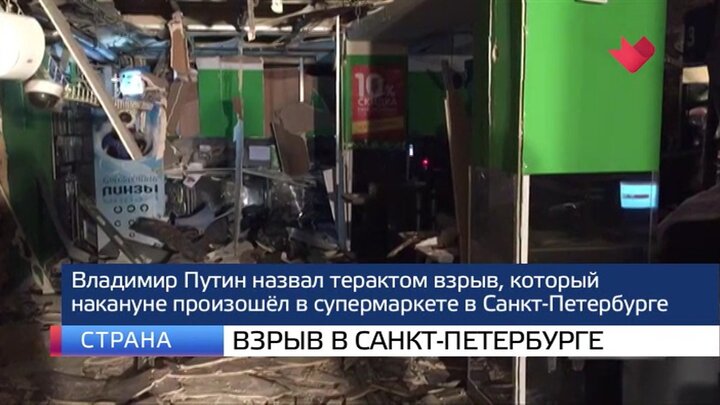 Владимир Путин назвал терактом взрыв, который накануне произошел в супермаркете на Кондратьевском проспекте в Санкт-Петербурге. По предварительным данным, сдетонировала самодельная бомба, мощностью 200 граммов в тротиловом эквиваленте. Устройство было начинено поражающими элементами.