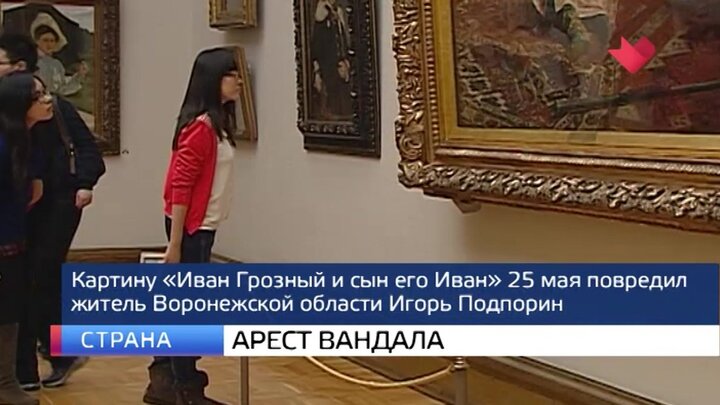 Замоскворецкий суд Москвы арестовал мужчину, который повредил картину Ильи Репина. Игорь Подпорин заключен под стражу до 26 июля. Кроме того, ему предъявили более тяжкое обвинение. Следствие ужесточило квалификацию преступления с первой части статьи на вторую. Она предусматривает лишение свободы сроком до шести лет. В ходе заседания обвиняемый признал свою вину и добавил, что "возможно, сожалеет о содеянном". Его адвокаты настаивали на домашнем аресте. Инцидент в Третьяковской галерее произошел в 25 мая. Металлической стойкой ограждения Игорь Подпорин разбил стекло, защищавшее картину "Иван Грозный и сын его Иван" и порвал холст в трех местах. Также серьезно пострадала авторская художественная рама. Самая ценная часть картины – изображения лиц и рук Ивана Грозного и царевича – уцелели. Ущерб, нанесенный галерее, оценили в шестизначную сумму. По словам экспертов, только первый этап реставрации поврежденного полотна может обойтись в десять миллионов рублей.
