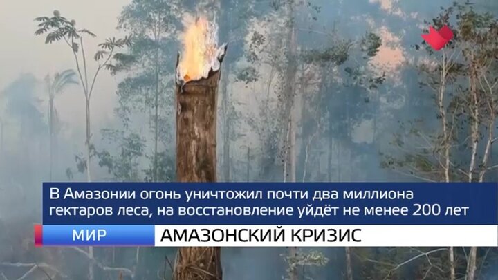 В Амазонии огонь уничтожил почти два миллиона гектаров. По предварительным подсчетам экологов, только за этот год уже выгорело примерно полпроцента от всей площади джунглей. На их восстановление потребуется не менее 200 лет.