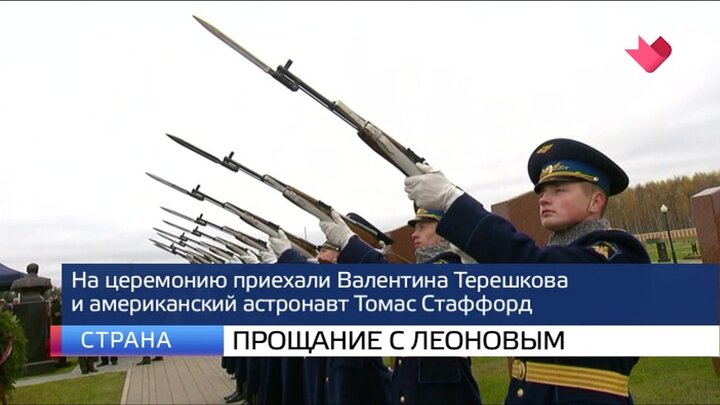 В Подмосковье простились с легендарным космонавтом Алексеем Леоновым. На военном мемориальном кладбище в Мытищах собрались сотни человек: близкие и друзья Алексея Архиповича, космонавты, руководители российской ракетно-космической отрасли. На церемонию также пришли министр обороны Сергей Шойгу и участник миссии "Союз-Аполлон" американский астронавт Том Стаффорд. Дважды героя советского союза похоронили с воинскими почестями, рота почетного караула дала салют из карабинов.