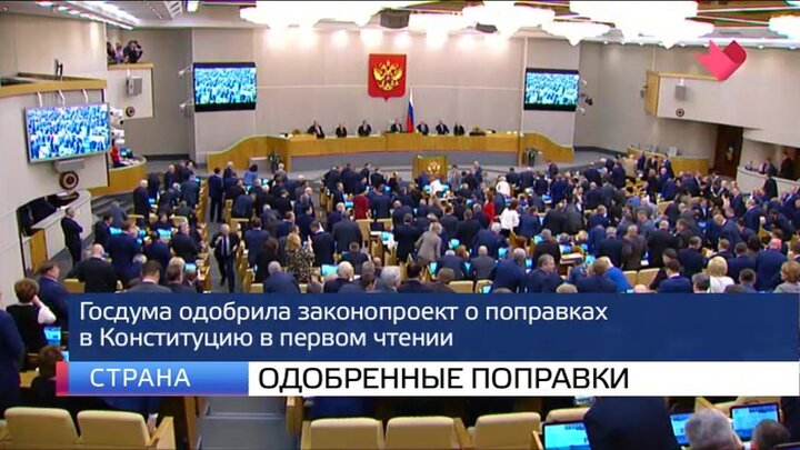 Госдума одобрила законопроект о поправках в Конституцию в первом чтении. Документ поддержали единогласно все 432 депутата. По словам председателя нижней палаты Вячеслава Володина, предложенные президентом изменения главного закона страны во втором чтении могут рассмотреть уже 11 февраля.