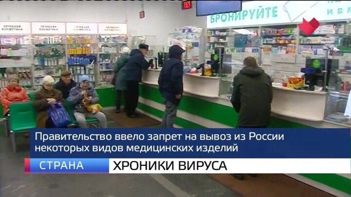 Тем временем, в России правительство ввело запрет на вывоз из страны некоторых видов медицинских изделий, в том числе на респираторы, очки, костюмы химзащиты, бахилы, маски, бинты, вата, некоторые противовирусные препараты, а также перчатки и халаты.