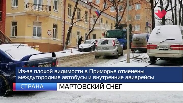 Приморье засыпало снегом, непогоду принес мощный циклон. Движение во Владивостоке парализовано. Из-за того, что снег был мокрым, на дорогах мгновенно образовался накат. Многие улицы превратились в ледяные горки. Наиболее опасные участки с крутыми спусками и резкими поворотами перекрыли. Однако десятки аварий уже успели случиться. На дороги вышло более ста снегоуборочных машин и целая армия дворников. Из-за плохой видимости и гололеда отменены 15 междугородных автобусов. Объездную трассу во Владивостоке закрыли для грузовиков. Изменения и на табло аэропортов, там нет внутренних авиарейсов. По прогнозам, снегопад не прекратится до четверга, 5 марта.
