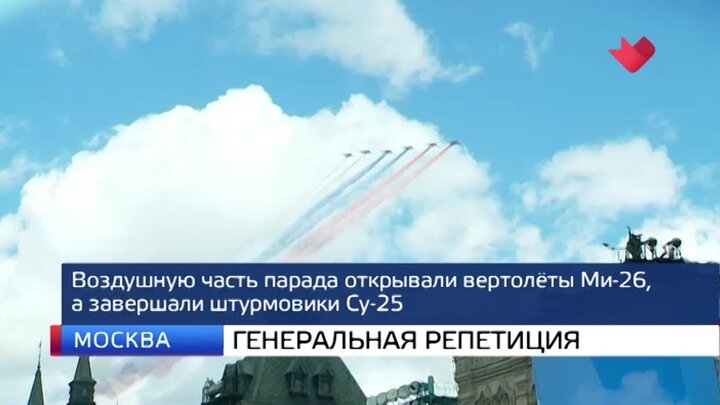 Что касается механизированной колонны, то в параде в этом году задействуют сразу несколько типов танков, включая легендарные Т-34. Воздушную же часть открывали вертолеты Ми-26, а завершали штурмовики Су-25, которые выпускают дым в цветах флага России.
