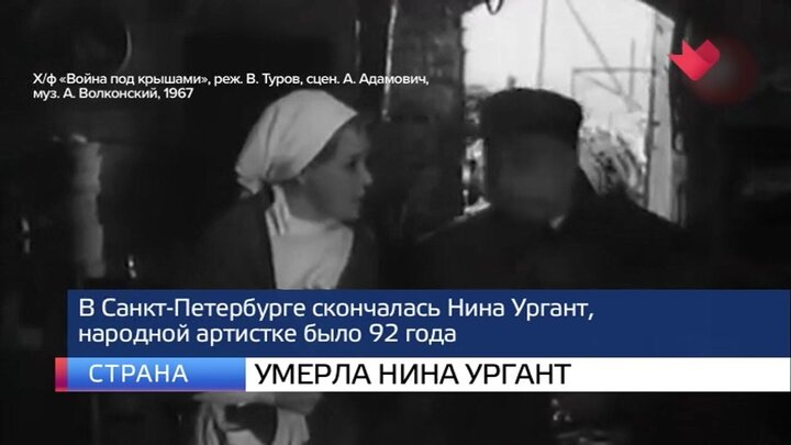 Скончалась Нина Ургант. В Александринском театре, где она прослужила более 30 лет, сообщили, что народная артистка умерла у себя дома, в Санкт-Петербурге. Ей было 92 года. Нина Ургант окончила театральный институт имени Островского и начала работать в театре в Ярославле, а затем стала актрисой Ленинградского театра имени Ленинского комсомола, где сыграла более 20 ролей. В 1962 году Нина Ургант перешла в Александринский театр. И тогда же сыграла свою первую большую роль в кино.