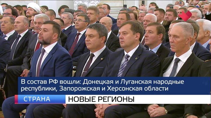 В Большом Кремлевском дворце состоялось подписание четырех договоров о принятии в состав Российской Федерации новых субъектов. Это Донецкая и Луганская народные республики, Запорожская и Херсонская области. Церемония прошла в Георгиевском зале. В мероприятии приняли участие президент, а также главы ДНР и ЛНР Денис Пушилин и Леонид Пасечник, руководитель Запорожской области Евгений Балицкий и глава Херсонской Владимир Сальдо. На церемонии президент выступил с речью.