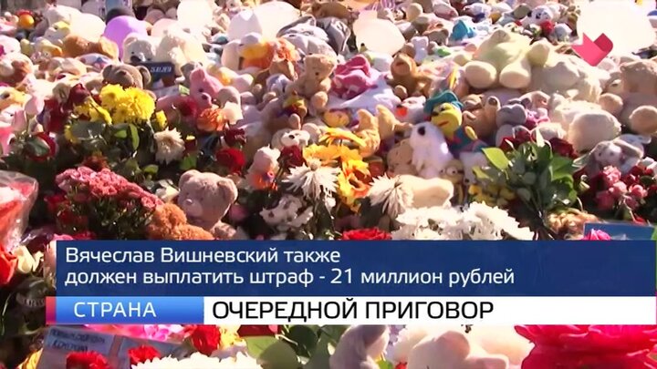 Суд Кемерова назначил бывшему гендиректору и совладельцу ТЦ "Зимняя вишня" Вячеславу Вишневскому восемь лет лишения свободы в колонии строгого режима. Он также должен заплатить штраф размером в 21 миллион рублей. Гендиректора признали виновным в даче взятки при реконструкции торгово-развлекательного центра. В итоге ремонт выполнили с нарушениями – в здании не было автоматических систем пожаротушения. Вячеслав Вишневский был арестован в марте 2019 года, он стал последним задержанным фигурантом. Следственный комитет расследовал четыре уголовных дела, связанных с пожаром в "Зимней вишне". Трагедия в четырехэтажном торговом центре произошла весной 2018 года. Погибли 60 человек, большинство из них – дети.